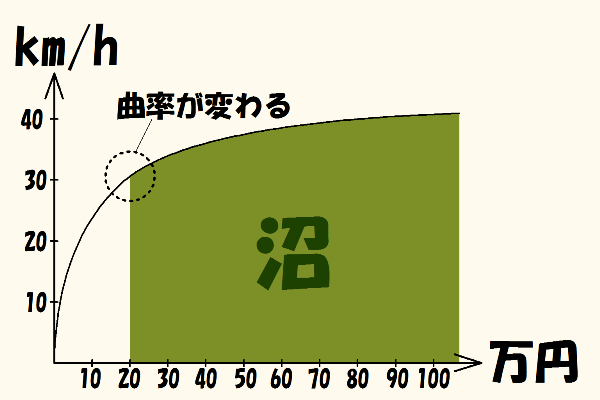 上図のように、価格とスピードの関数は、曲率が一定ではありません。あるところまで急で、そこからは緩やかになります。
