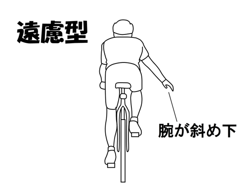 一番よく見かけるのは、腕を斜め下にだす、こちらの型ですね。ひかえ目な意思表示です。進路変更はしたいけど、それを強く主張するのも気が引ける、そういう葛藤が腕の角度に表れています。