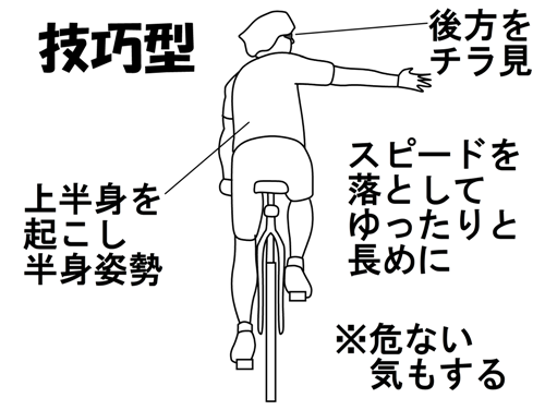 これは滅多に見ませんけど、じっさい見ると「おぉ~」って思います。バランスを崩しやすいですし、一瞬のチラ見とはいえ前方不注意になりやすいので、ちょっと怖いのですよね。でも、車の流れに割って入るとき、後方のドライバーさんに対し「ここ入りますよ」という明確な意思をアピールできます。