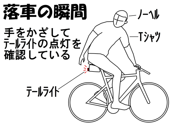 本来なら、信号で停まった時などに確認すれば良いのですが、横着な私は、走りながらそれを確認しようとしました。上半身を起こし、半身をよじり、右手をライトにかざして、赤い光がちゃんとついているかを確認しようとしたそのとき、突然ハンドルが「グラグラグラグラ」とアンコントロール状態になり、体が前方に放り出されるように落車しました。