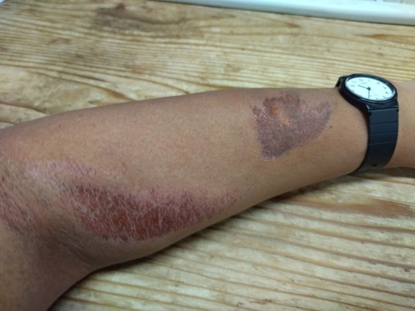 帰宅して、体の傷を確認したところ、左腕に二箇所、左肩に一箇所、擦り傷がありました。Tシャツは肩のところに穴があいてました。傷はヒリヒリいたかったですけど、事故当日は普通に我慢できるくらいの痛みでした。