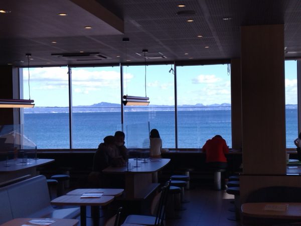数年前の台風で損壊して、新しく建替えたばかりなので、建物が新しくてキレイです。都会のマクドナルドと違って、2階の客席がユッタリ快適です。そして最高なのが、2階のカウンター席からの眺め! めちゃ絶景🤯