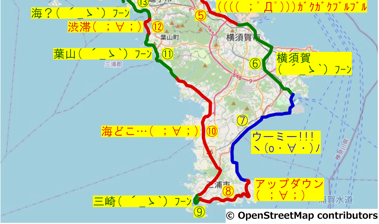 ミウイチって、走ってていつも思うのですけど、西側が退屈なのですよね。もちろん、三浦半島を一周することが目標なのでしたら不可避なのですけど、私は最近ではもう、半周してそのまま来た道を戻ることが多いです。そのほうが、三浦海岸を二度走れて、満足度が高いかなと。帰り道でまた、横須賀街道のトンネル地帯や、湾岸道路を通るのはちょっと怖いのですけど。よかったら参考にしてみてください。