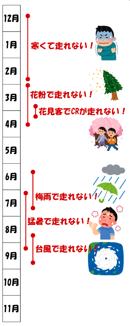 地域によっては、積雪、黄砂、連休の渋滞とかが加わります。