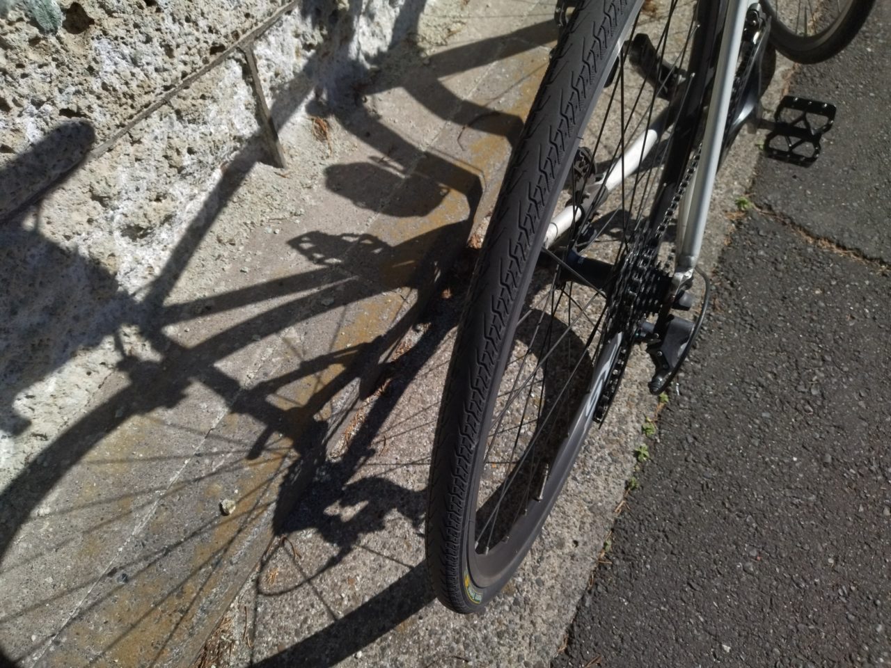 よく信号待ちで前に自転車がいるとき、「どんな自転車かな?」とつい色々観察してしまうのですけど、ロードバイク乗りの皆さんのタイヤはホント細いですね。それで表面ツルツル。たぶん薄いゴムなのでしょう。ロードって基本スピード重視だから、当然といえば当然なんでしょうけど、でも「パンクしたらどうするの!?」って思います。