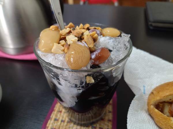 個人的にデザートもオススメです。ロングライド中は、冷たくて甘いものが欲しくなるのですよね。飯田牧場のアイスも美味しいですけど、「椅子に座ってテーブル席でゆっくりいただきたい」ってときは、こっちがオススメです。この日たべたグラスゼリーは、コーヒーゼリーにココナツクリームと砕いた氷をかけた上に、小豆とナッツがトッピングされたもの。メチャ美味しいです。
